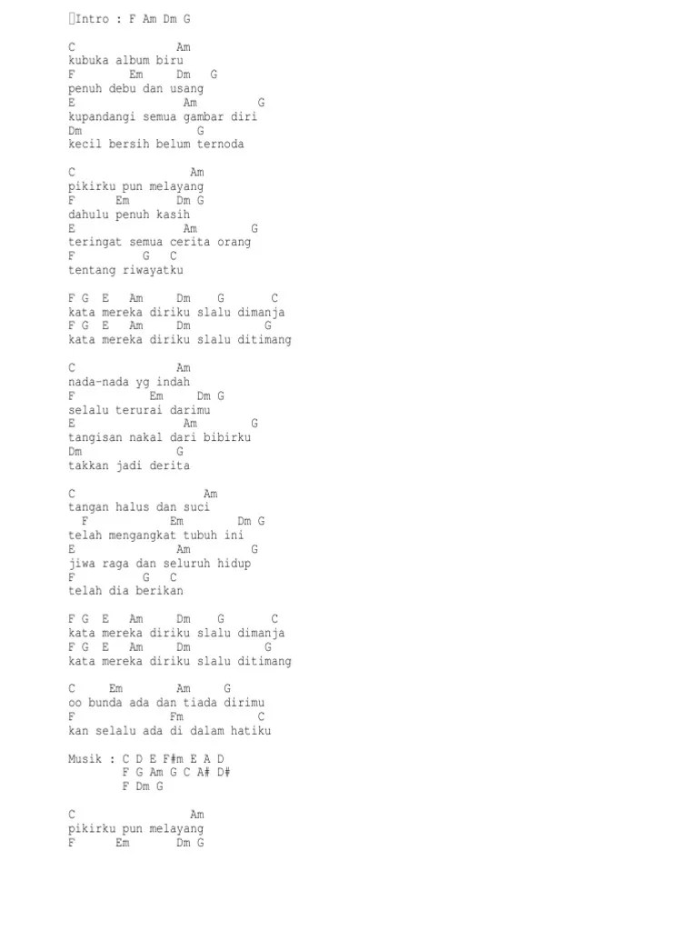 Berikut chord gitar dan lirik lagunya: F c dm g penuh debu dan usang. Ckubuka c/balbum biruam g fpenuh debemu dan udmsang g ekupandangi semua amgambar dirig d7kecil bersih belum gternoda. F am dm g …. Chord gitar dan lirik lagu 'bunda' milik band potret/ melly goeslaw. Ungkapkan kecintaanmu pada sang ibu lewat lagu lirik dan chord kunci gitar . E am g kupandangi semua gambar diri. Not angka bunda ini bisa kamu mainkan pada pianika, piano dan seruling. Cpikirkuc/b pun melayamang g fdahulu . Bm em am g kupandangi semua gambar diri. F am dm g …. F am dm g c am kubuka album biru f em dm g penuh debu dan usang e. C em am g kubuka album biru f.